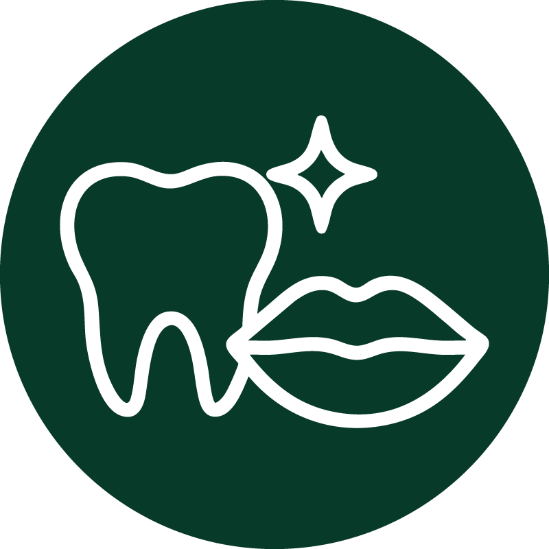• Illustration d'une dent et de lèvres avec un éclat, symbolisant un sourire éclatant ou le blanchiment dentaire.
