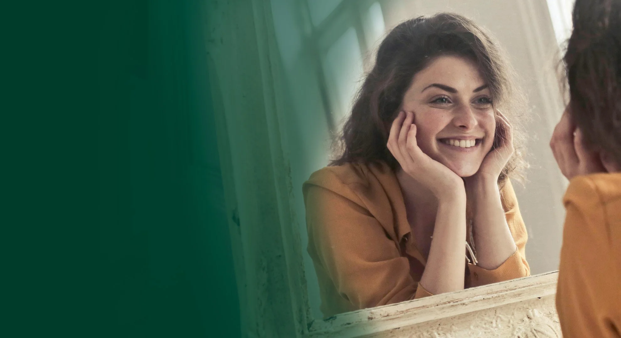 Femme souriante devant un miroir après des soins dentaires esthétiques, sourire éclatant et confiant.