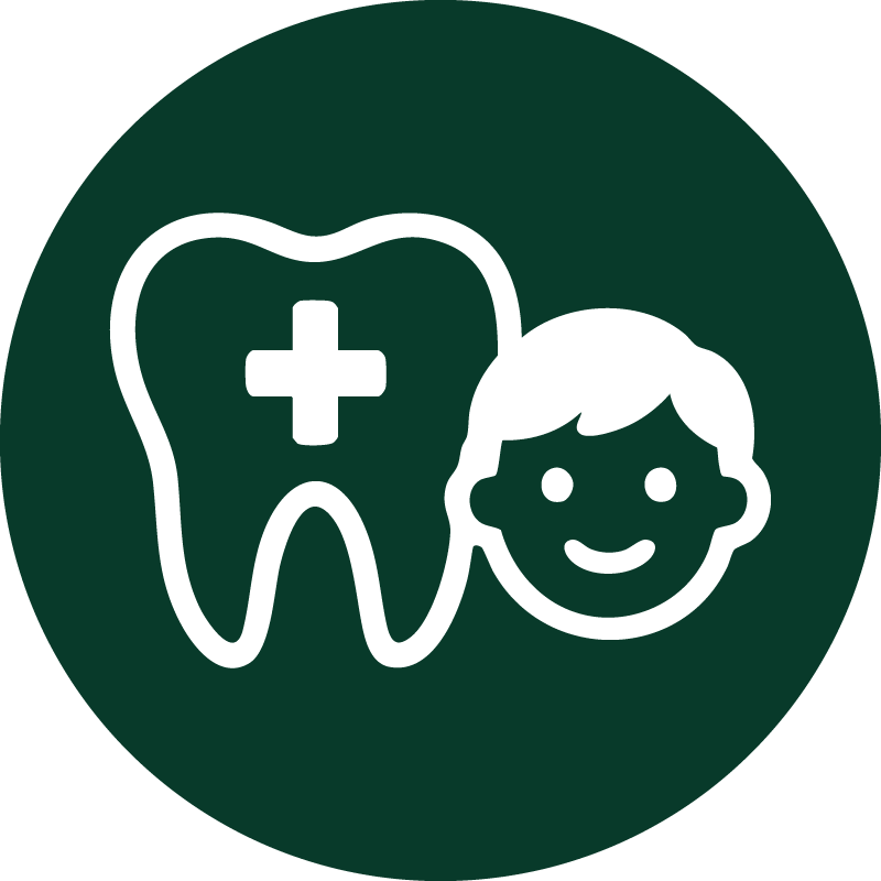 • Illustration d'une dent avec une croix médicale à côté d'un visage d'enfant souriant.